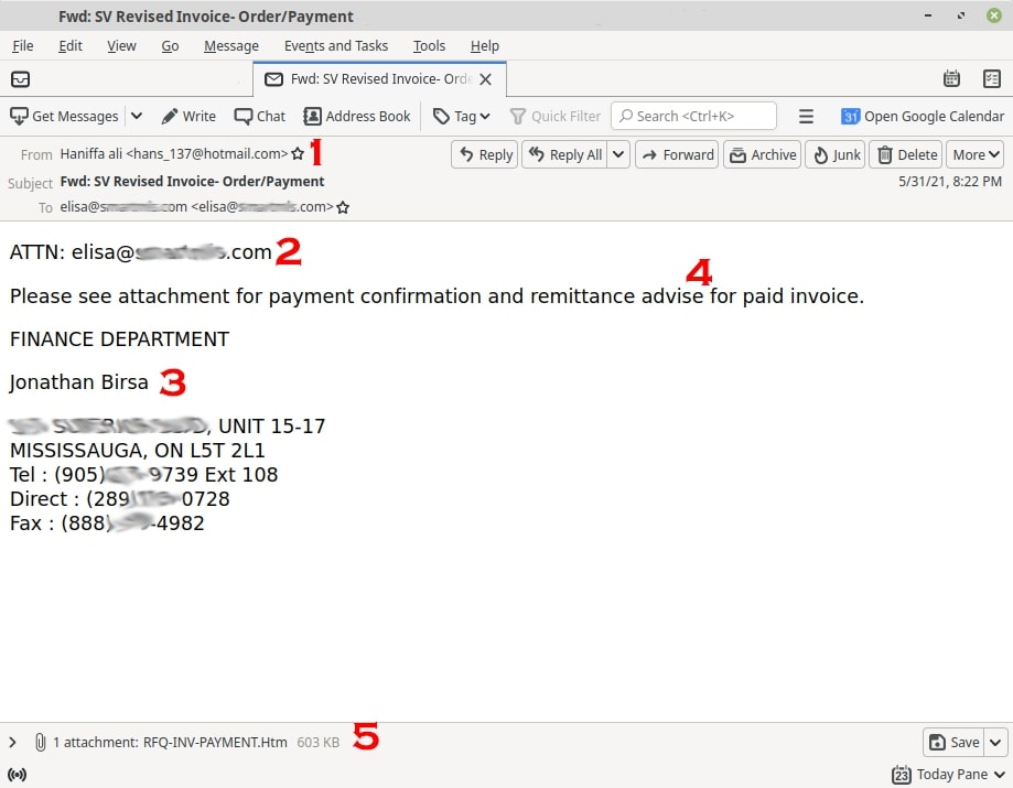 This is a phishing attempt we caught that tries to use our familiarity with common brands (1 & 4) to gain the trust of the recipient and lower our guard enough to click the file attached to the email. Once the recipient opens and clicks on the attachment, a javascript application runs on the victim's computer, building a backdoor to the cyber criminal’s network where they can take control of the computer to be used in other attacks.