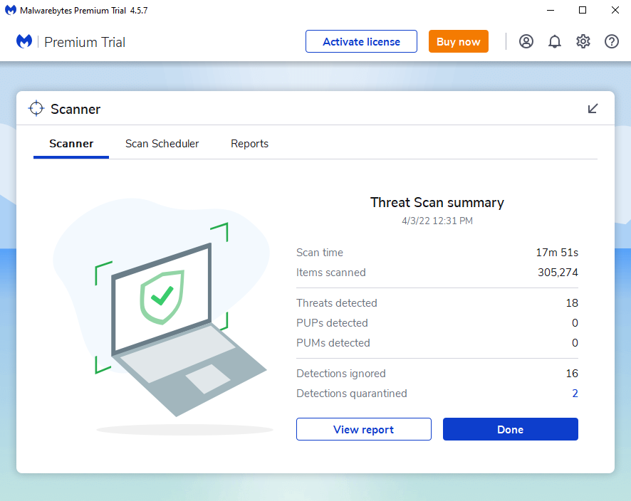 • Run a complete virus scan on your entire computer. If you happen to have another non-persistent (not always running) antimalware tool installed, like Malwarebytes, run that, too, when this is done.